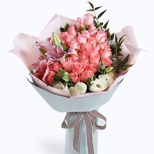戴安娜粉玫瑰29枝,粉色香水百合2枝,搭配白色桔梗2枝花束 ← Previous Next → P款:戴安娜粉玫瑰29枝,粉色香水百合2枝,搭配白色桔梗2枝花束 P款:戴安娜粉玫瑰29枝,粉色香水百合2枝,搭配白色桔梗2枝花束