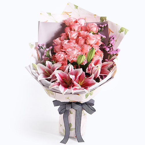 黛安娜粉玫瑰33枝,粉色香水百合3枝花束