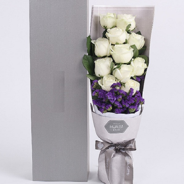 A款:高档礼盒装鲜花:雪山玫瑰11枝、深紫色勿忘我0.3扎