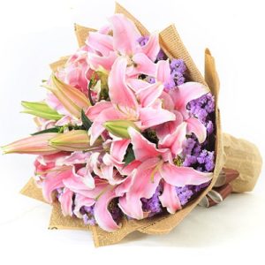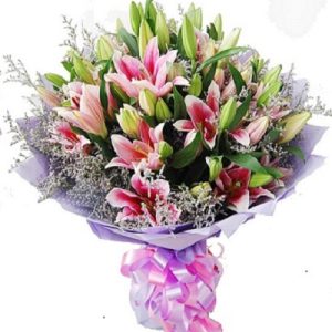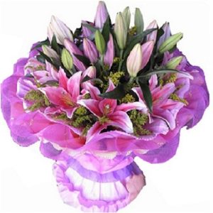 E款:19支粉色香水百合,淡紫色包装。