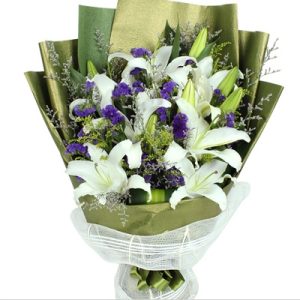 G款:9支白色香水百合,淡紫色包装。