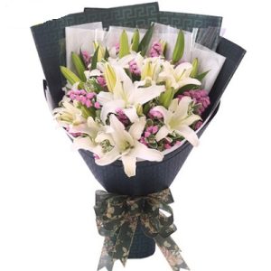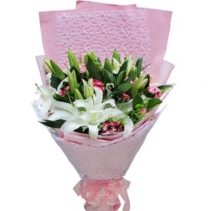 Q款:3支白色香水百合,5支粉色百合,粉色包装。