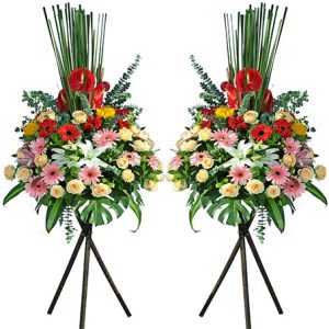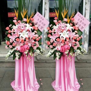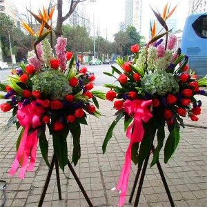 说明:标价均为单个的花篮价格,免费送条幅或贺卡,花篮条幅格式:祝XXX店开业大吉生意兴隆,XXX恭贺。花篮贺卡格式:纸卡上面:祝XXX店,纸卡中间:开业大吉或乔迁之喜,纸卡下面:XXX恭贺。辅花材可用价值相同花材代替,花篮架子以当地的为准,形状花材不变,量大优惠,详情咨询客服。