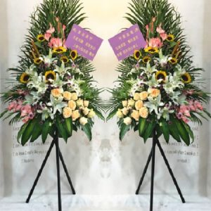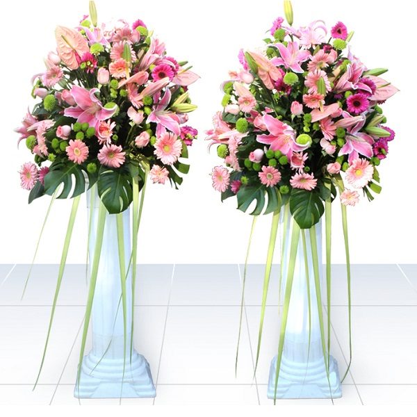 E款:罗马柱花篮,太阳花,百合花,玫瑰花,乒乓菊等,绿叶丰满。