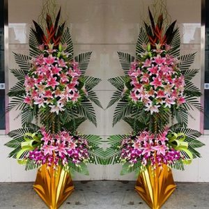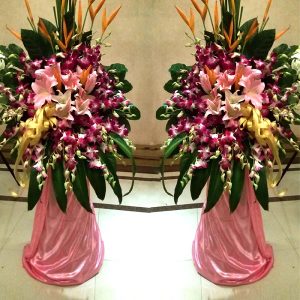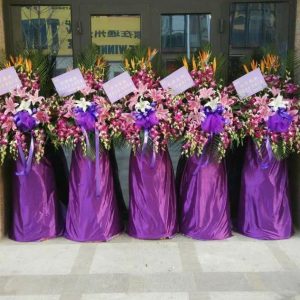 K款:洋兰,百合花,富贵鸟等,绿叶丰满,下围紫色纱幔花架。