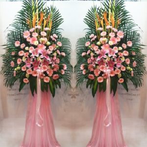 B款:太阳花,百合花等,绿叶丰满,下围粉色纱幔花架。