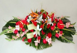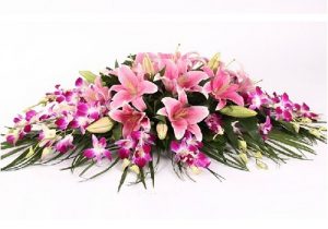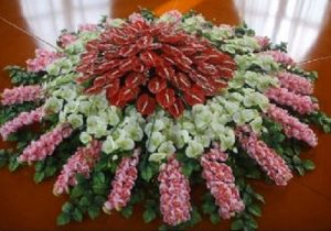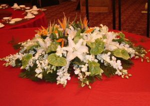 桌花、台花、会议花、接待台花、餐桌花,是指装饰于会议桌、接待台、演讲台、餐桌、几案等场所的花饰。在实际生活中应用也非常普遍。因其常使用花钵作为容器,因此也被称作钵花。桌花一般置于桌子中央(如中餐桌、圆形会议桌和西餐桌等)或一侧(如演讲台、自助餐台、双人餐桌等)。桌花可以是独立式或组合式,会议主席台、演讲台等还常结合桌子的立面进行整体装饰。从造型上,可以有单面观、四面观,构图形式多样,有圆形、球形、椭圆形等对称的几何构图,也有新月形、下垂形等各种灵活多变的不规则式构图,构图主要取决于桌子的形状、摆放的位置及需要营造的气氛。因为花钵有普通式和高脚式,因此桌花也可以做成低式桌花和高式桌花,桌花的高低取决于装饰的场合和需要营造的气氛。