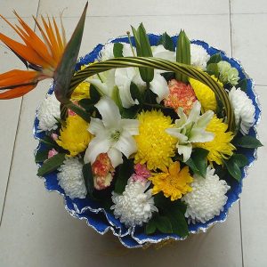 商品材料:白菊花、小鸟、黄菊花、红掌、白玫瑰、洋兰、白百合花、天堂鸟、太阳花、康乃馨等。