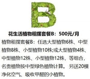 租赁:在自己和单位养护条件不好时,可以租摆。虽然每月付租金,但不用担心植物养不好所造成的损失。例如买一颗发财树260元左右,但养三个月就死了,一年买4次,就得花1000多元,再加上购买时的来回车费,平时还得费心费力的照管它,实在辛苦;而租一棵60元/月,一年720元,平时有专人负责照管,树死了出租方负责更换,既少花钱,又省心省力,也是一种不错的选择。