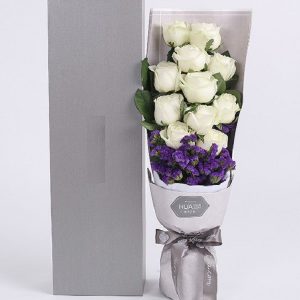 - A款:高档礼盒装鲜花:雪山玫瑰11枝、深紫色勿忘我0.3扎
