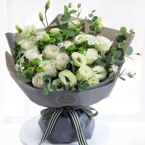 - B款:白玫瑰11枝+绿色桔梗5枝,小菊3枝,白色石竹梅4枝