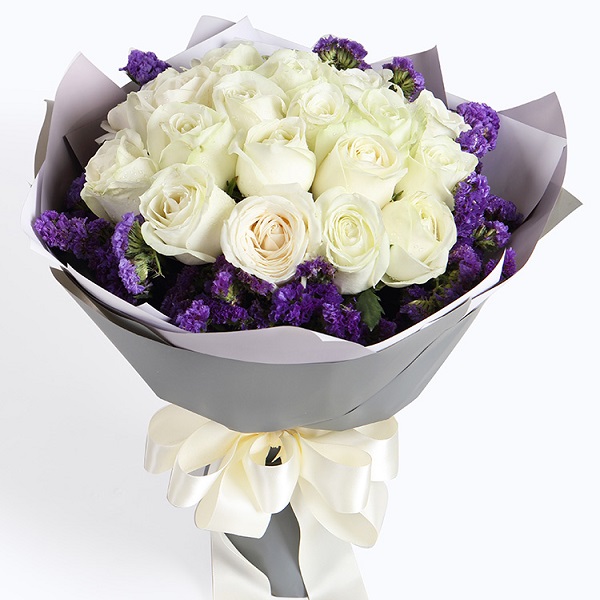 D款:雪山白玫瑰19枝,紫色勿忘我围绕。内层双色人造纸(浅紫色、香芋紫),外层深灰色opp纸,米白色缎带花结。