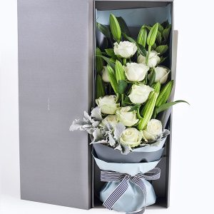 E款:雪山白玫瑰11枝、白百合3枝、银叶菊0.5扎、栀子叶2枝。蓝灰色绝色纸1张,灰色雾面纸1张,白蓝细纹罗文带1米、60#大号魔力铁山灰包装盒。