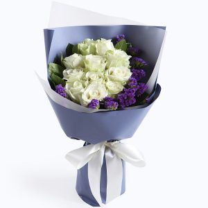 - F款:雪山白玫瑰11枝,搭配适量紫色勿忘我栀子叶