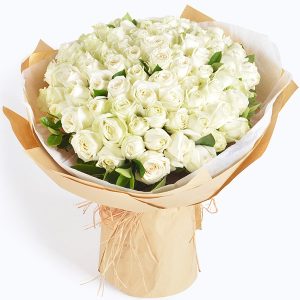H款:白玫瑰99枝,栀子叶适量。内层白色雪梨纸,外层牛皮纸,拉菲草缎带花结。