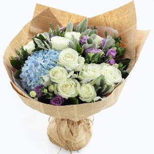- N款:白玫瑰11枝、浅蓝绣球1枝、浅紫色洋桔梗5枝