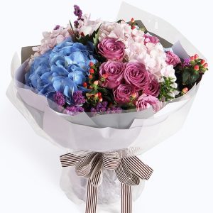 C款:蓝绣球2枝,粉绣球1枝,紫玫瑰9枝,红豆3枝,搭配适量紫红色勿忘我(如当地红豆缺货,用相思梅等其他寓意相近配材替代。)包装:双色人造纸(浅紫色、香芋紫),深灰色opp纸,玻璃纸,白咖色罗纹缎带