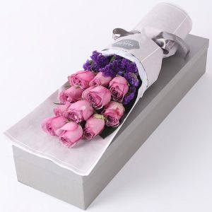 - E款:高档礼盒装鲜花:紫色玫瑰11枝、深紫色勿忘我0.3扎