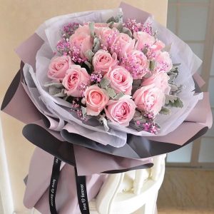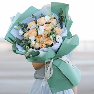 A款花束:12朵香槟玫瑰花加桔梗、尤加利等配花。