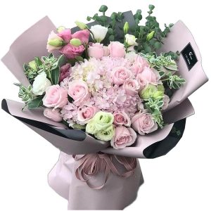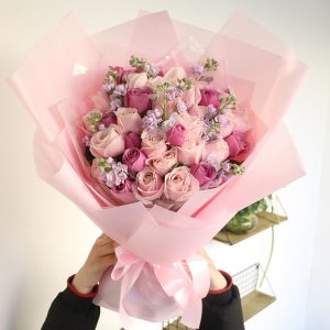 D款花束:戴安娜加桃花玫瑰共33支加11支紫罗兰。