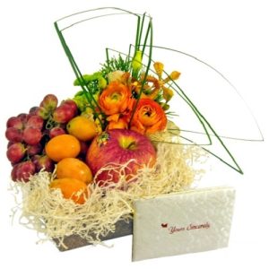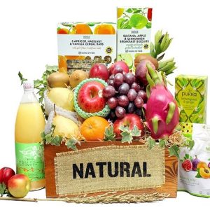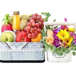 A款:此果此组合包含一篮花艺摆设及营珍上品冰糖金丝燕窝 / Marks & Spencer鲜果汁送上祝福。此果蓝内有6款时令水果,进口提子,火龙果,奇异果,水晶梨/丰水梨,橙/西柚,富士苹果,仿竹制造型礼篮 。