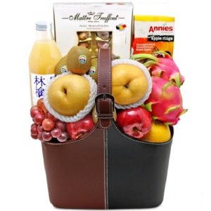B款:日本青森县, 100% 苹果汁,比利时Maitre Truffout/Melbon贝壳软心朱古力,Annies / Tarla 天然有机无添加果干,内含高级水果六款(标准果量大约6-8pcs)(水果重量约为2KG/6LB),进口盒装蓝莓/进口盒装水果,进口提子/盒装奇异果,火龙果,富士苹果,橙/西柚,番石榴/桃驳梨,高身人造皮提篮(紫/咖啡色)。