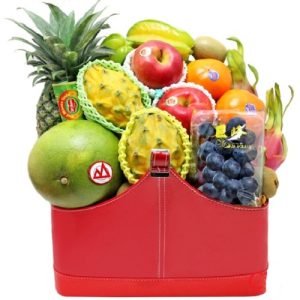 V款:此果蓝内有6款时令水果,进口提子,火龙果,奇异果,水晶梨/丰水梨,橙/西柚,富士苹果,法国波尔多AOC红酒,Godiva, 比利时, Chocoiste朱古力豆 57g,Godiva 朱古力蝴蝶酥,Godiva Chocolatier 朱古力砖 / 朱古力高袋装,人造皮两边有手挽礼篮。