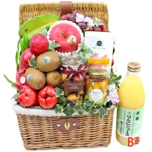 P款:此果篮内有6款新鲜水果(标准果量大约8-12pcs),日本青森县苹果,进口提子/进口盒装水果,桃驳梨/天桃,奇异果,火龙果,水晶梨/啤梨,日本青森县, 100% 苹果汁,Bliss / Tarla 天然有机无添加果干,Pukka有机绿茶/ Marks & Spencer柠檬姜花旗参茶包20pcs,Marks & Spencer蜂蜜燕麦饼 (或其他味道) ,Marks & Spencer 健康谷物条,田园风格木质礼物篮。