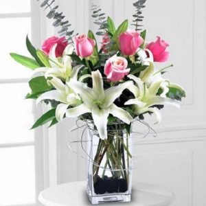 [材料]:精品粉色玫瑰6枝、多头白百合2枝,适量配花配草,高档包装,搭配精美玻璃瓶