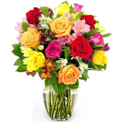 [材料]:精品各色玫瑰12枝,时令花材搭配,精美玻璃花瓶包装!