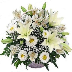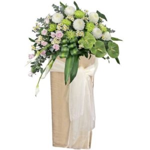 [花材]:白色百合花,小白菊,时令花材搭配,花材会根据当地习俗适当调整,哀思手提花篮。