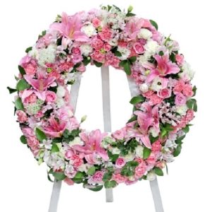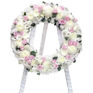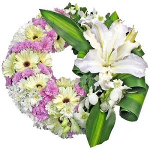 [花材]:白事花圈由蜜桃雪山玫瑰,黄百合,白太阳花,香槟桔梗,粉菊花,衬叶等花材组成。