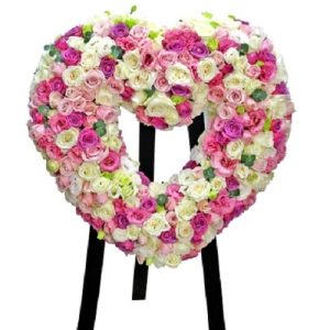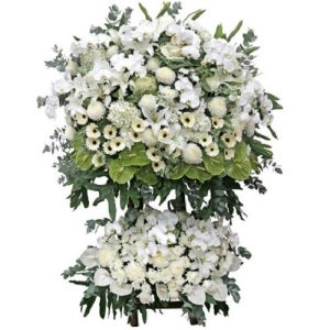 [花材]:心型殡仪花牌,全白色玫瑰围上衬叶,客户可订高架或短架,一般为短架。