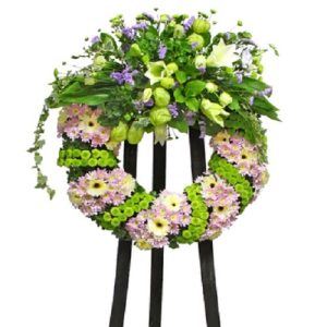 [花材]:吊唁花圈, 由紫色和绿色小菊花组成螺旋圈身,圈顶由百合和衬叶完成, 圆形花圈约1.3米高,上面放置白底黑字卡牌。