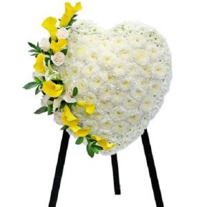 [花材]:心型殡仪花牌,白小菊及大波花为底组成心型,配搭黄马蹄,米白玫瑰花及大白百合而保持清雅,加上名贵的法国叶造型,及特别设计挽词圈。