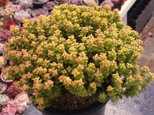 小米星是景天科青锁龙属的多肉,主茎为丛生状,有猫瘟的发枝,時间养久了茎会慢慢半木制化,主茎肉质叶灰绿至淡绿色,叶缘稍具鲜红色,在晚秋和初春,温度差大的那时候鲜红色尤其显著。