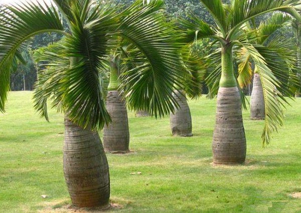 羽状叶,拱形,旋转,整齐排列成2列,在基部侧向扭转而使羽片叶面与叶轴所在平面成45°,形成优美的叶冠茎,特别是其茎干光滑而中下部膨大,形似酒瓶,更具观赏价值。不论室内盆栽,还是庭院栽培都是优良的观赏绿化树种。