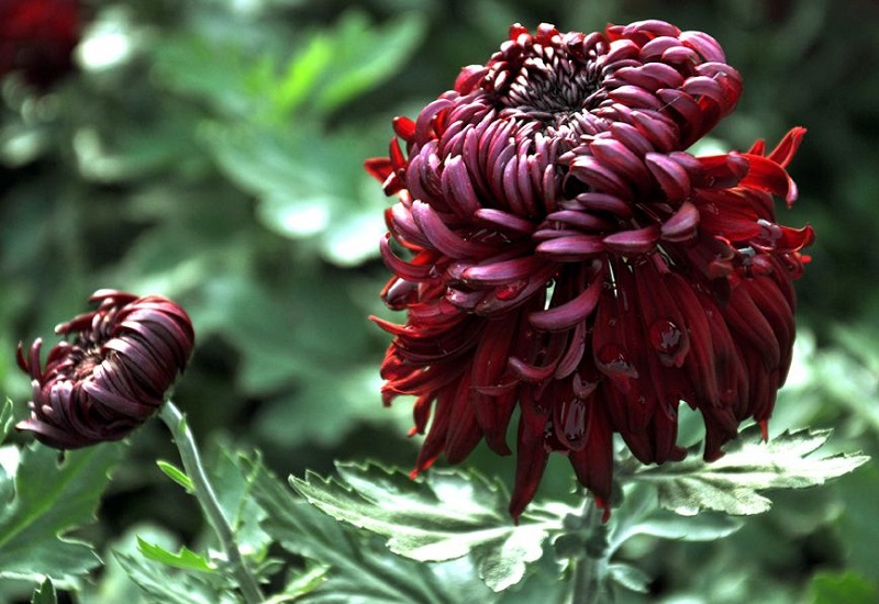 墨菊(墨荷),深紫色,枝干黑紫,粗细不一;花开于老秋,晚于同类,色泽浓而不重,花盘硕大,花瓣中空末端弯曲,在色彩缤纷的秋菊衬托下,凝重不失活泼,华丽不失娇媚。