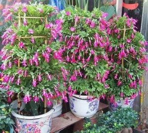 蟹爪兰别称:圣诞仙人掌、蟹爪莲、锦上添花、螃蟹兰,原产巴西;中国各地公园和花圃常见栽培。为观赏植物,常嫁接于量天尺或其它砧木上,以获得长势茂盛的植株。蟹爪兰喜欢温暖湿润的半阴环境,并不耐寒,冬季最好搬到室内,最低温度不能低于10℃,而其生长期的最适宜温度是20~25℃。喜欢疏松、富含有机质、排水透气良好的基质。蟹爪兰属短日照植物,每天日照8-10小时的条件下,2-3个月即可开花,可通过控制光照来调节花期。