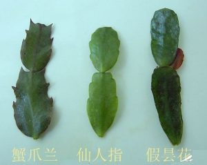 其实假昙花和昙花的区别很容易,难的是假昙花和蟹爪兰、仙人指的区别,而这其中又以假昙花和仙人指更不容易区别,下面是一张三者叶片的图,其中的假昙花叶子边缘的红边就不明显。