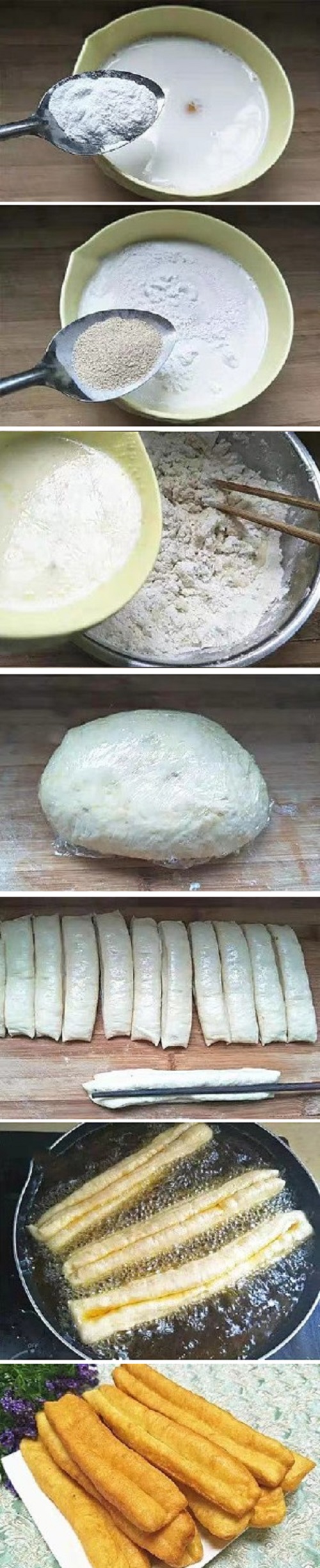 材料:面粉500g、盐5g、酵母3g、小苏打3g、水280g、油800g左右(20根左右的量)