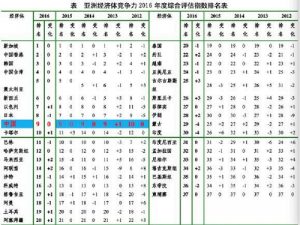 《亚洲竞争力2017年度报告》综合整体经济活力、商业行政效率、基础设施状况、人力资本与创新能力、社会发展水平5项指数得出综合竞争力排名。报告显示,在包括中国在内的亚太地区37个经济体中,2016年综合竞争力排名与2015年相差并不大,其中新加坡仍蝉联第一,中国稳居第九。