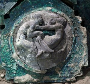这辆四轮花车在庞贝城外以北大约700米、一间古别墅内的马厩附近被发现,其车身由铁、青铜和锡组成,以及矿化的木质遗骸和有机材料的印记(从绳子到花卉装饰的遗迹)。它保存几乎完好无损,外观大致良好,花纹亦清晰可见。此外,车身保留着垫子和固定花环的绳索的痕迹,座位上还刻有两束麦穗。该马厩曾在2018年发现三只马匹的残骸。