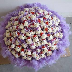 花材:2枝白香水百合,19枝粉康乃馨,黄莺适量搭配