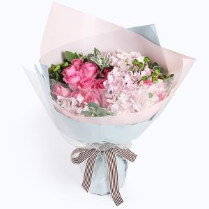 花材:粉色玫瑰5枝,橙色太阳菊6枝,粉色,紫红色康乃馨各10枝,紫翠菊,绿叶丰满