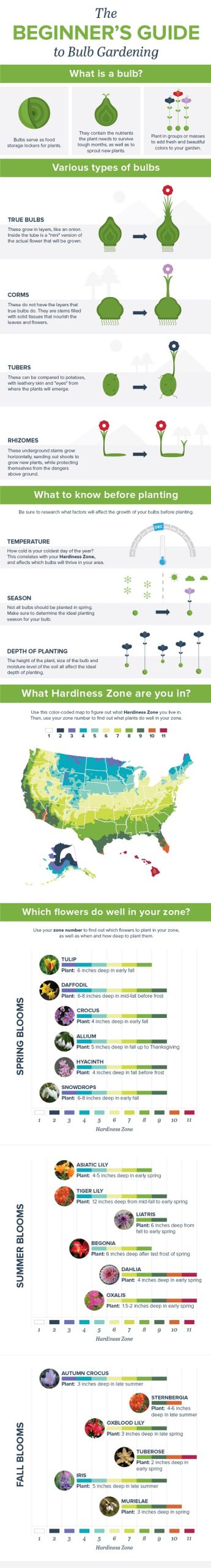 种植球茎时要记住的主要事情之一是季节。鳞茎一般在春季、夏季和秋季生长。虽然大多数球茎需要 6-8 周才能开花,但有些球茎可能需要更多时间,具体取决于您所在地区的区域、土壤和温度。另一件需要注意的重要事情是,一旦你的花球长大,就需要维护以保持它的色彩和活力。除了浇水、覆盖和施肥外,让它们远离小动物也非常重要。似乎有很多事情要弄清楚?幸运的是,此信息图包含您入门所需的一切。