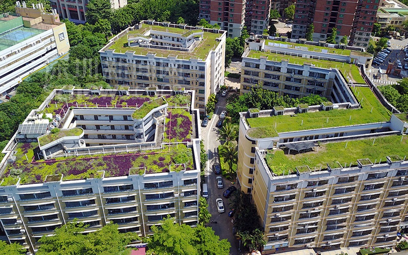 目前这项铺绿工程依然发挥着作用,从高空俯瞰,梅山苑楼顶一片绿色,与旁边的梅林后山植被连成一片,据了解,由于楼顶绿色植被的影响,夏天梅山苑安置房内的气温要比周围其他温度低,绿色植被降温效果明显。