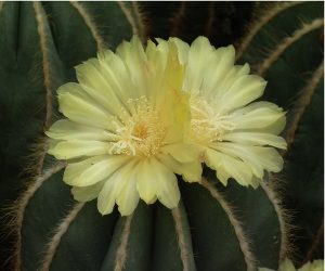 多年生肉质植物英冠玉,茎幼时球形,后随年龄增长渐变为圆筒形,直径20cm,高可达5m以上,易群生,蓝绿色,棱11-15。茎 顶密生绒毛。刺座密集,放射状刺12-15,毛状,黄白色,中刺8-12,针状,褐色。两种刺长均为约0.5cm-0.8cm。花大,直径达5cm-6cm,花冠漏斗状,鹅黄色。英冠玉花期6-7月。