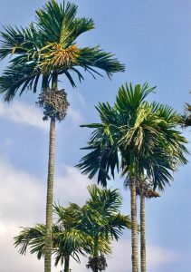 槟榔(学名:Areca catechu L.),是单子叶植物纲、初生目、棕榈科、槟榔树属常绿乔木,茎直立,乔木状,高10多米,最高可达30米,有明显的环状叶痕,雌雄同株,花序多分枝,子房长圆形,果实长圆形或卵球形,种子卵形,花果期3-4月。