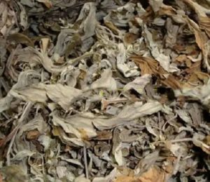 叶片多皱缩破碎,完整者展平后呈矩圆状椭圆形、椭圆形或矩圆状倒卵形,长3-10cm,宽2-5cm,两侧多少不对称,脉在下面隆起,第3级小脉近于平行,叶棕褐色,边缘有刺;叶柄短,长1-3mm。气微,味苦而甜。